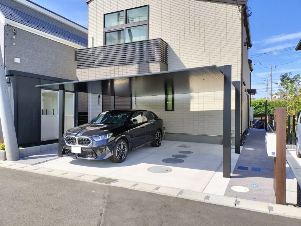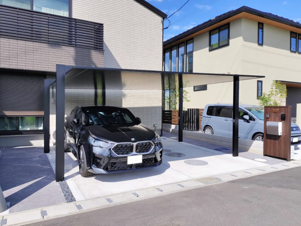 カーポートはLIXIL社 カーポートSC 2台用を採用、屋根材と柱の色はブラック。