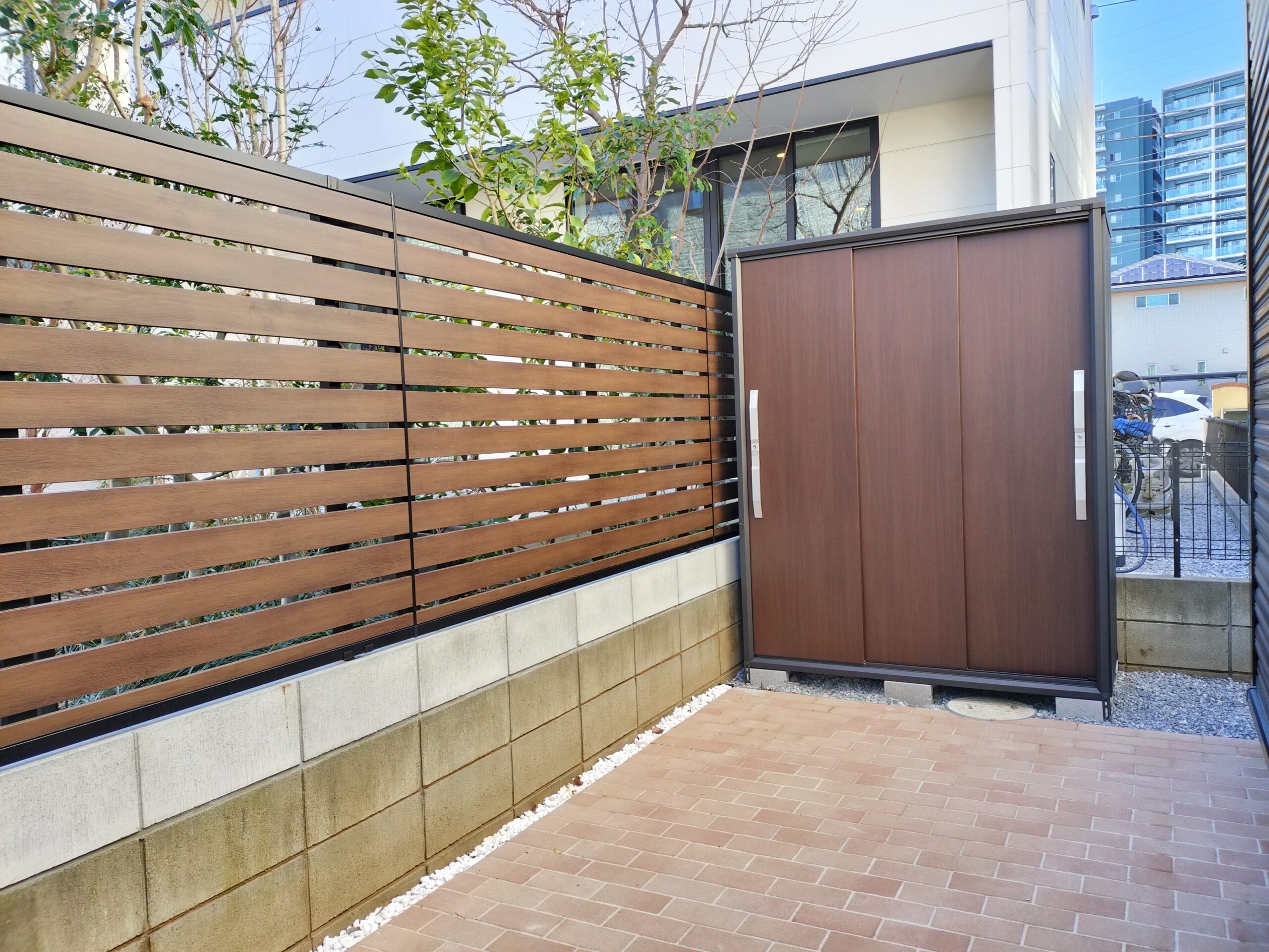 全体的に同系統の木目調デザインとなりました。おしゃれな物置はお庭の中心にあってもいいですね、フェンスと物置を併用した目隠しのご提案となりました。
