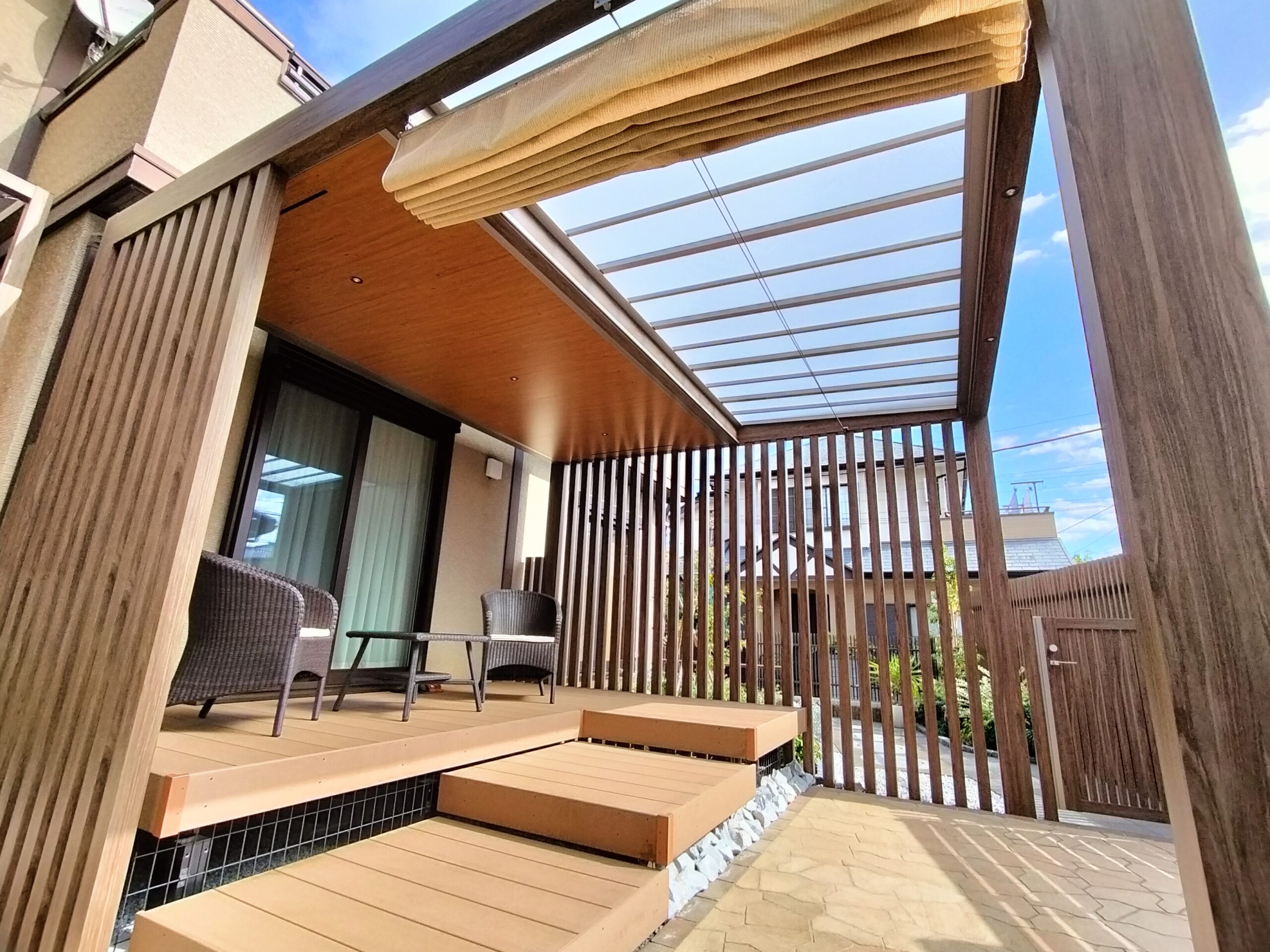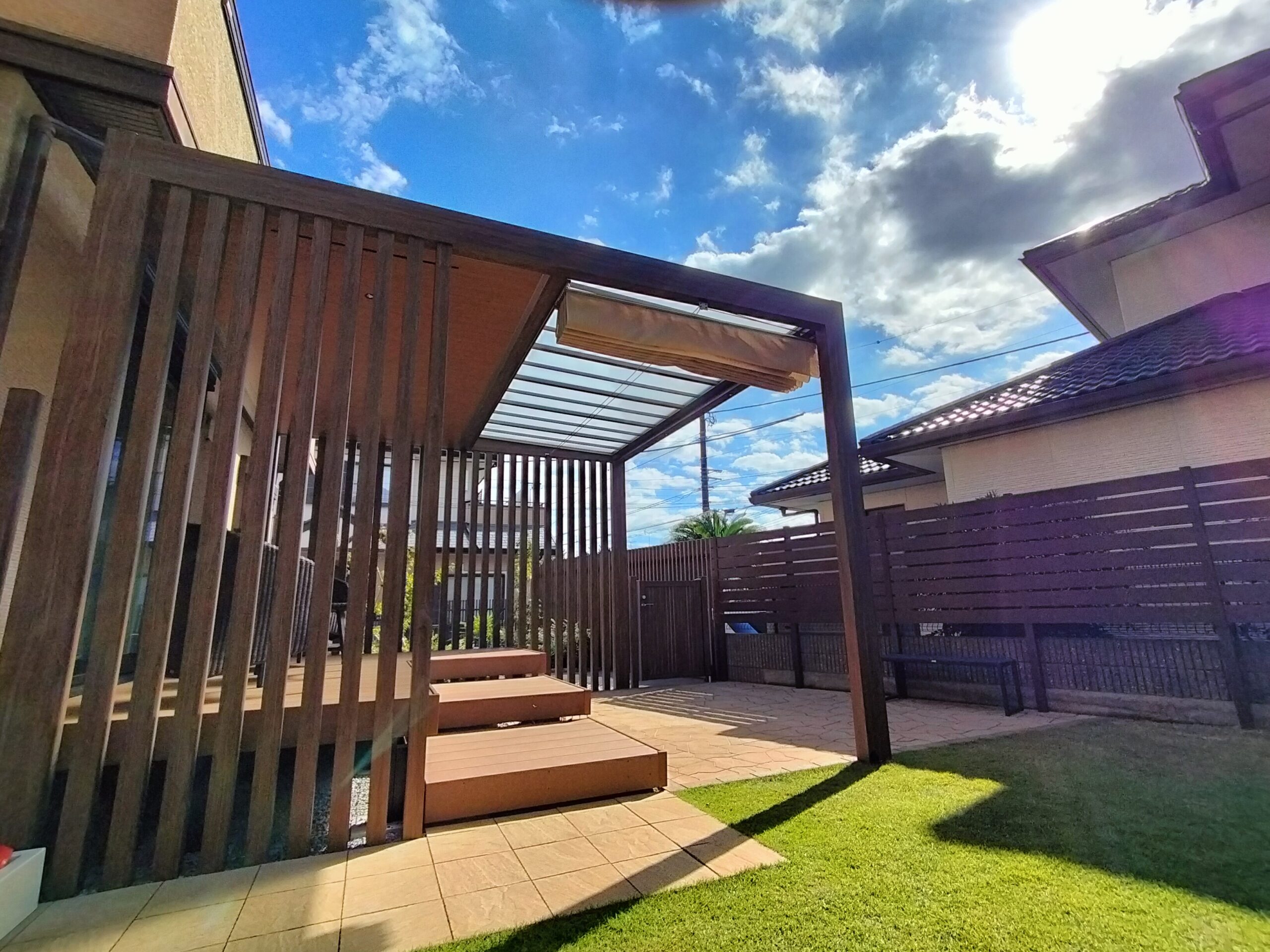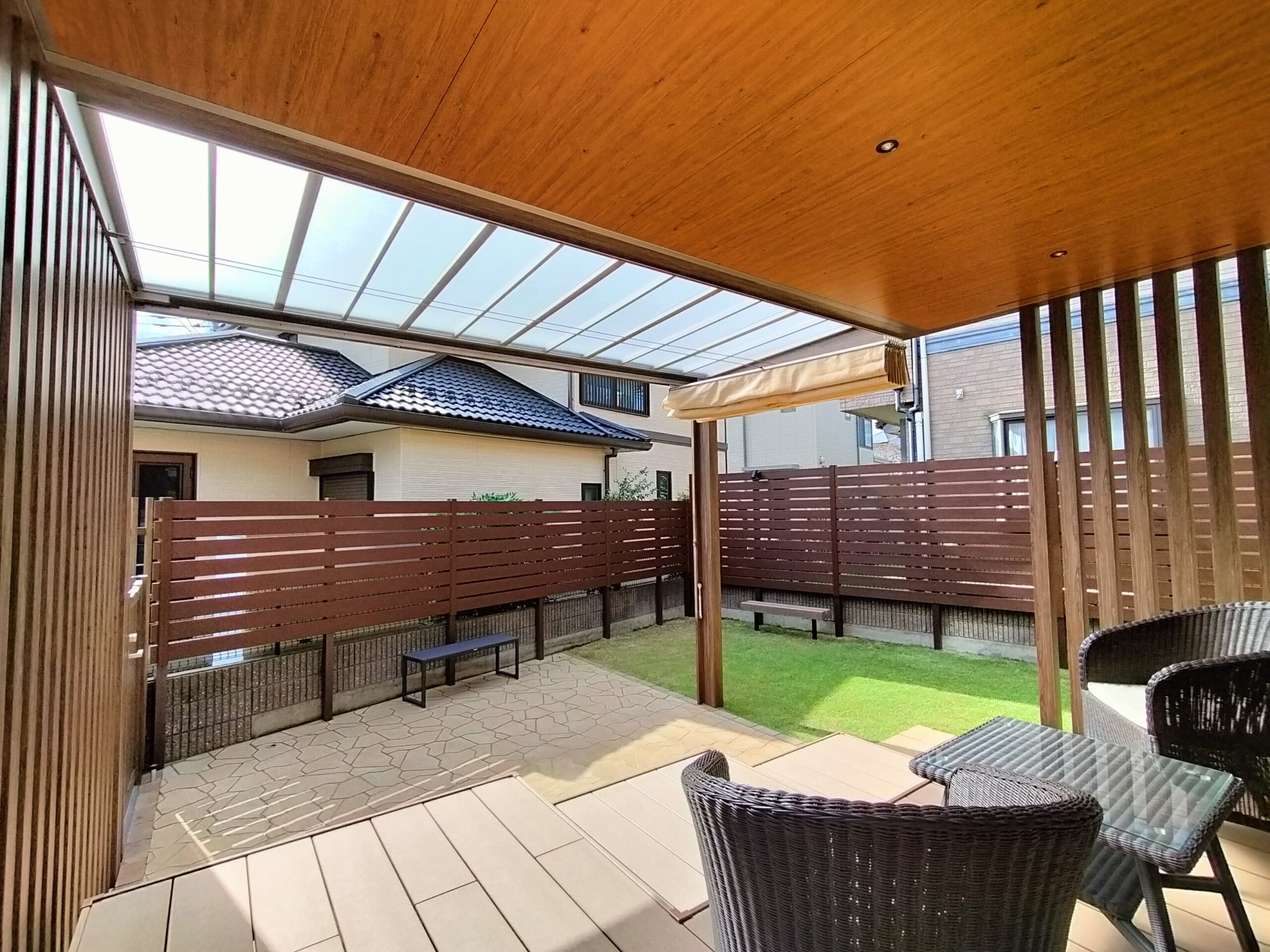 屋根は、タカショー社 ホームヤードルーフ。ルーフ部分は半分内天井としました。