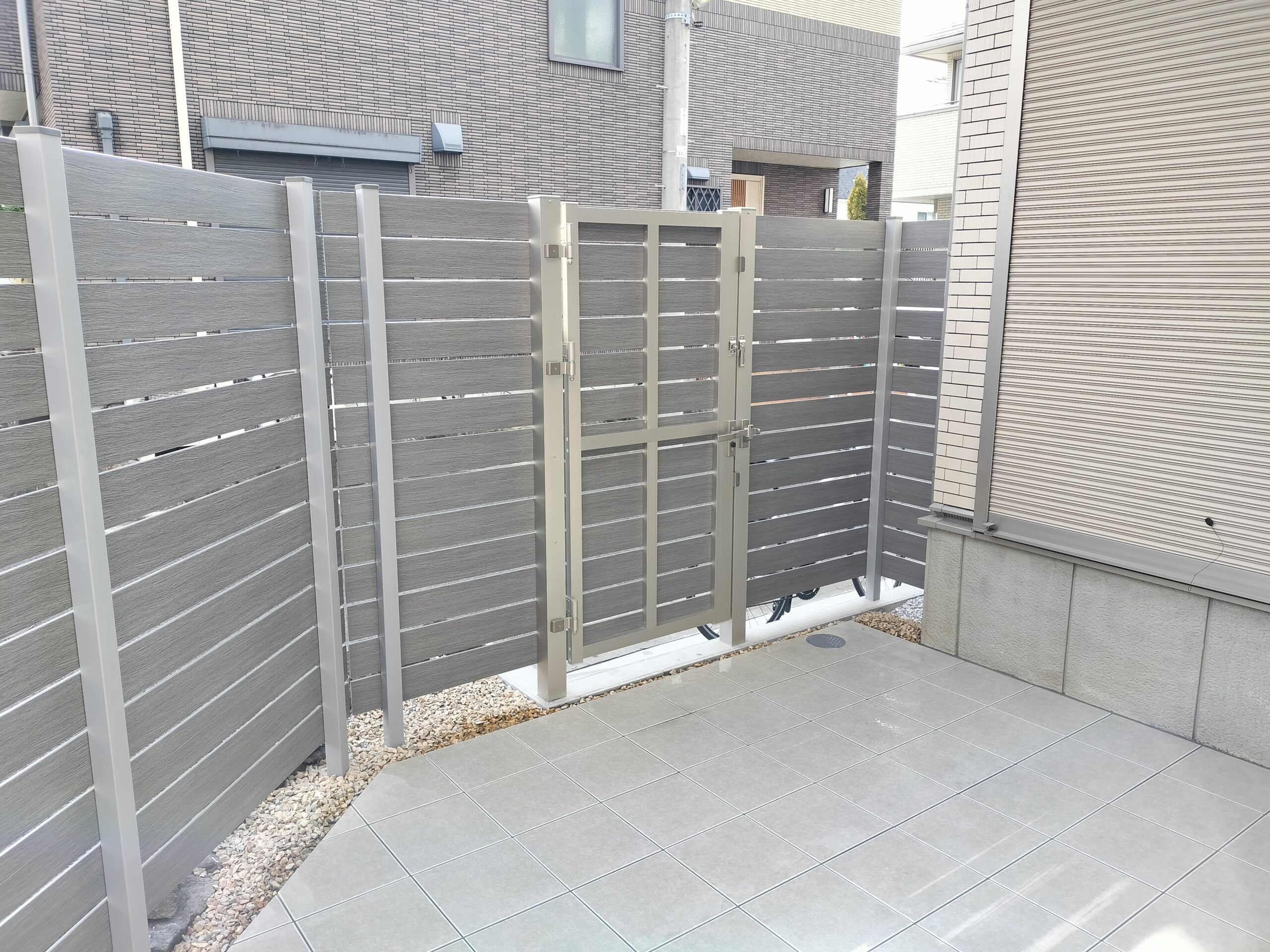 フェンスは、F&F マイティウッド プレミアム H1800、門扉は同社 マイティフィット門扉 W08 H18、カラーはモスグレーです。