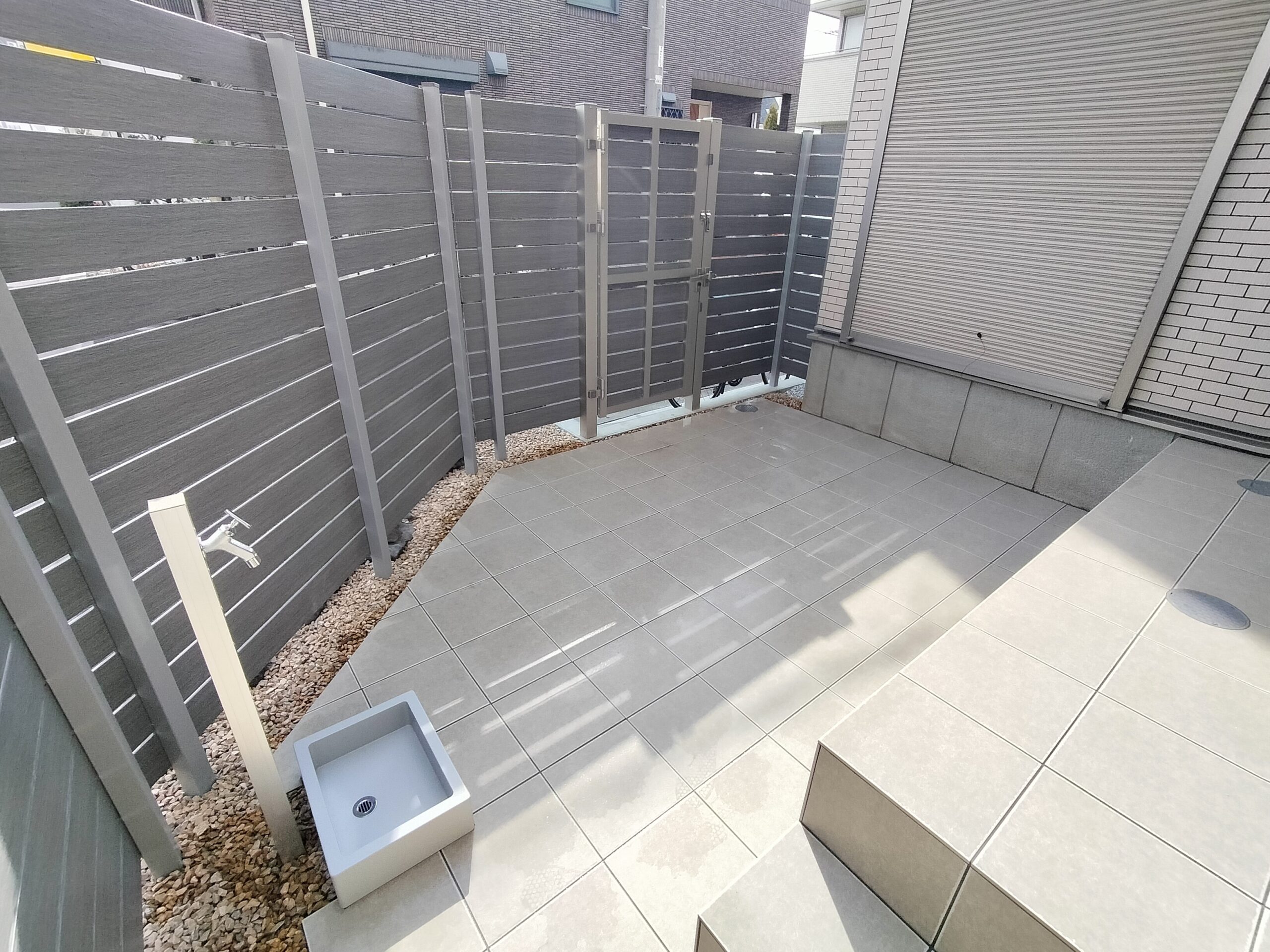 庭木の撤去と合わせて、既存のフェンス・ウッドデッキも撤去、お庭はタイルデッキとしました。