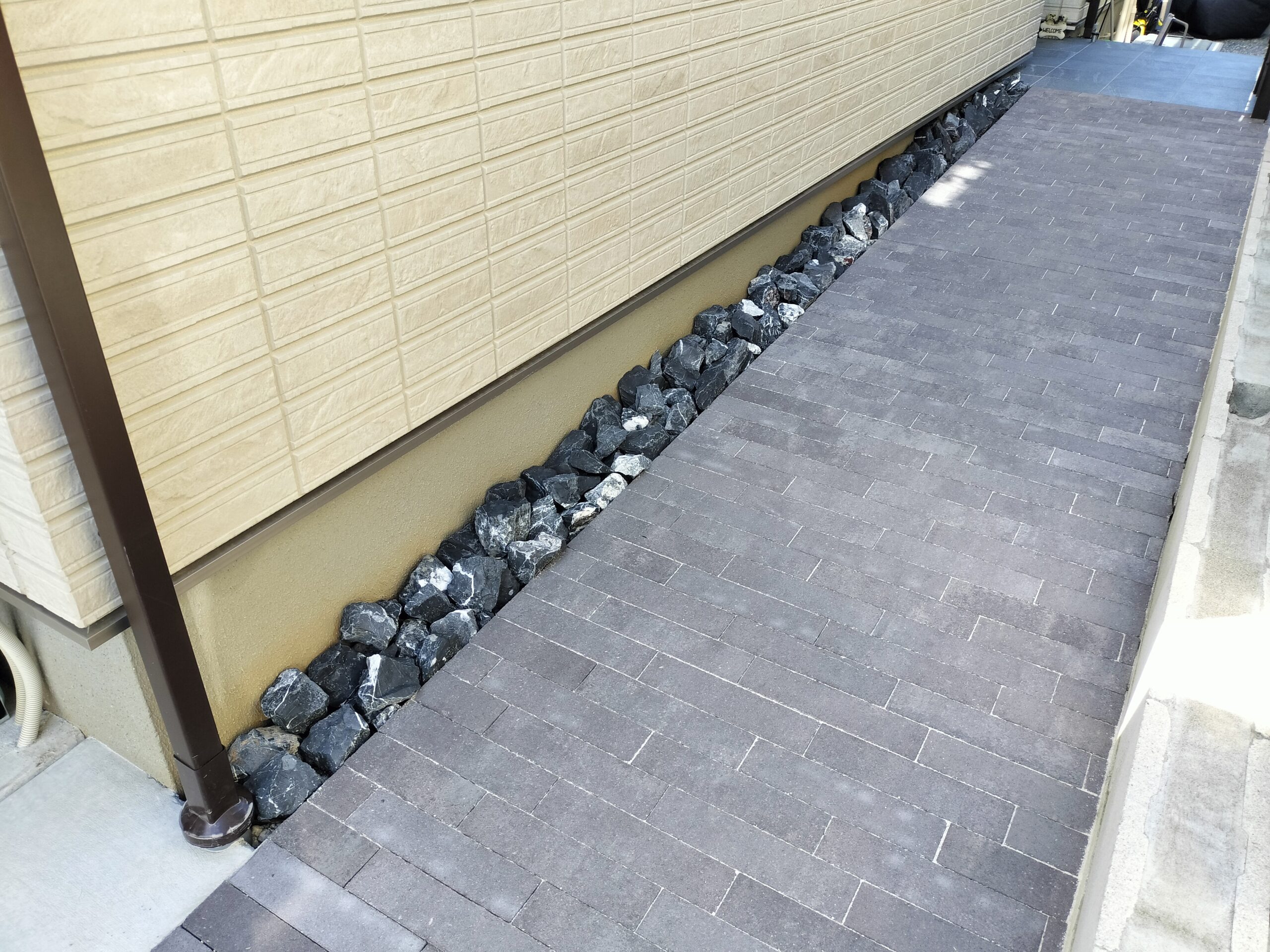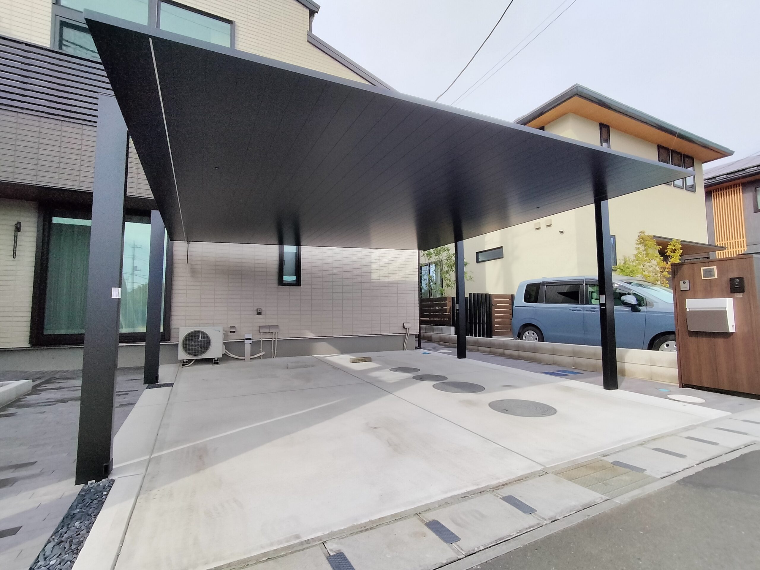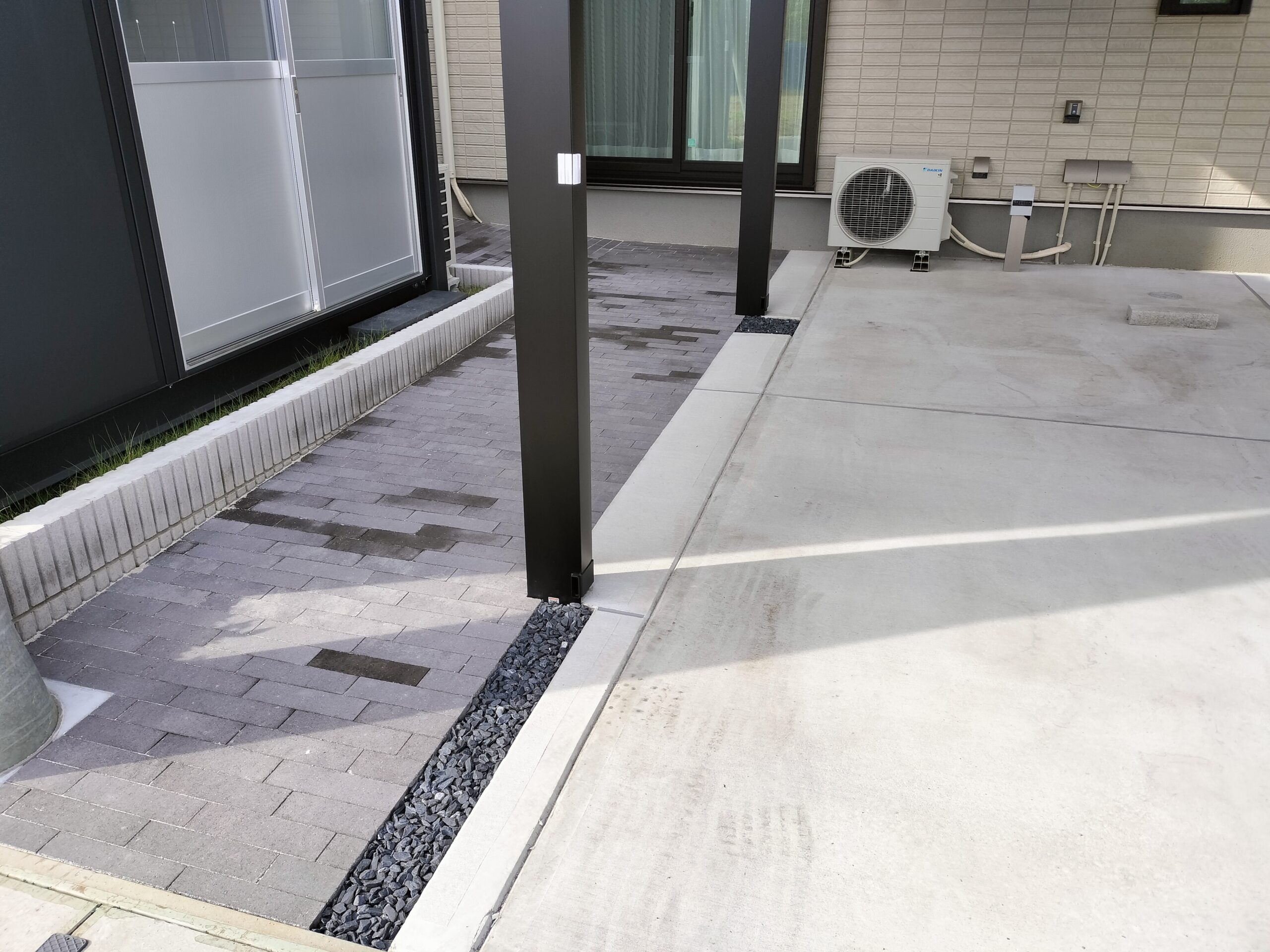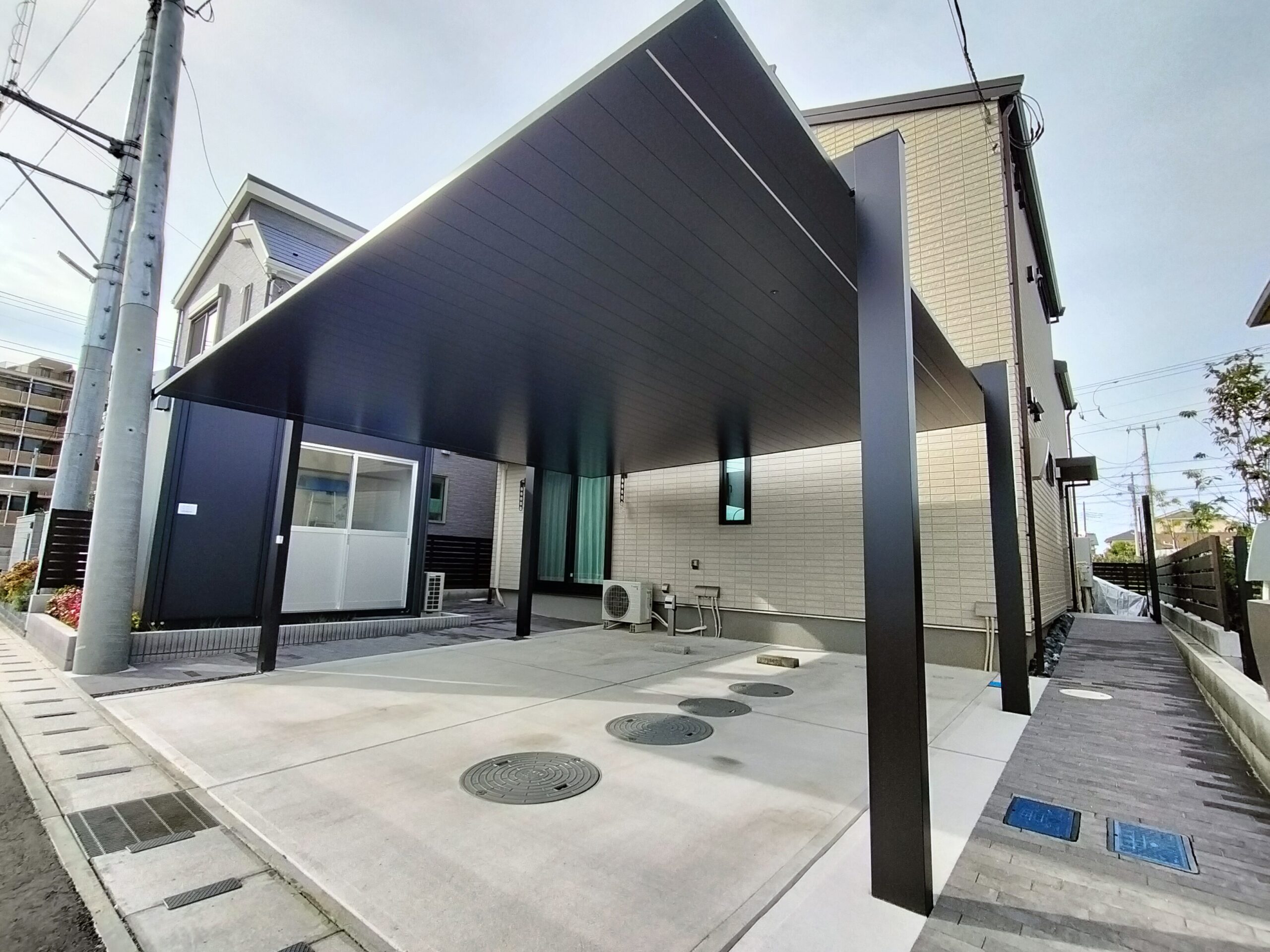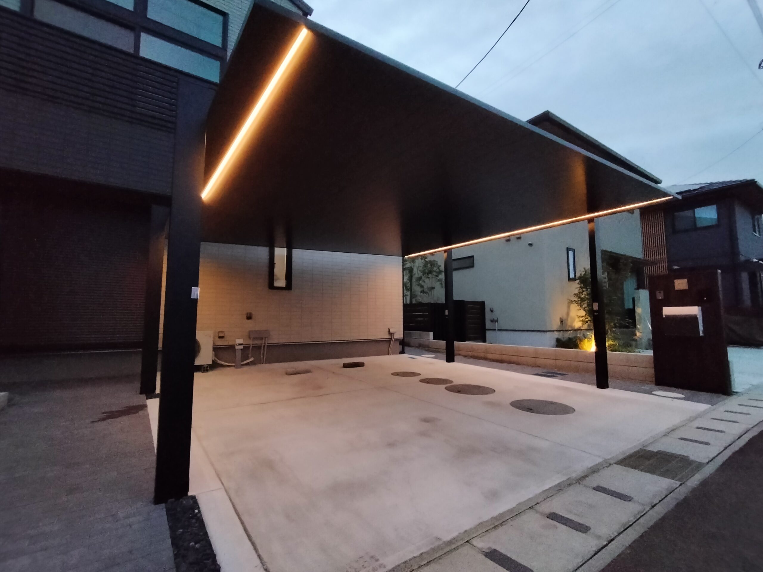 Y様邸は2世帯住宅で玄関はそれぞれ有り、両サイドからのアプローチ動線(インターロッキング舗装部)となっております。それぞれのアプローチ動線上にシームレスラインライトが両側にあるため、エクステリアプランに最適なカーポートのご提案となりました。 シームレスラインライトは人感センサ 段調光型ありを採用 Y様 ありがとうございました。
